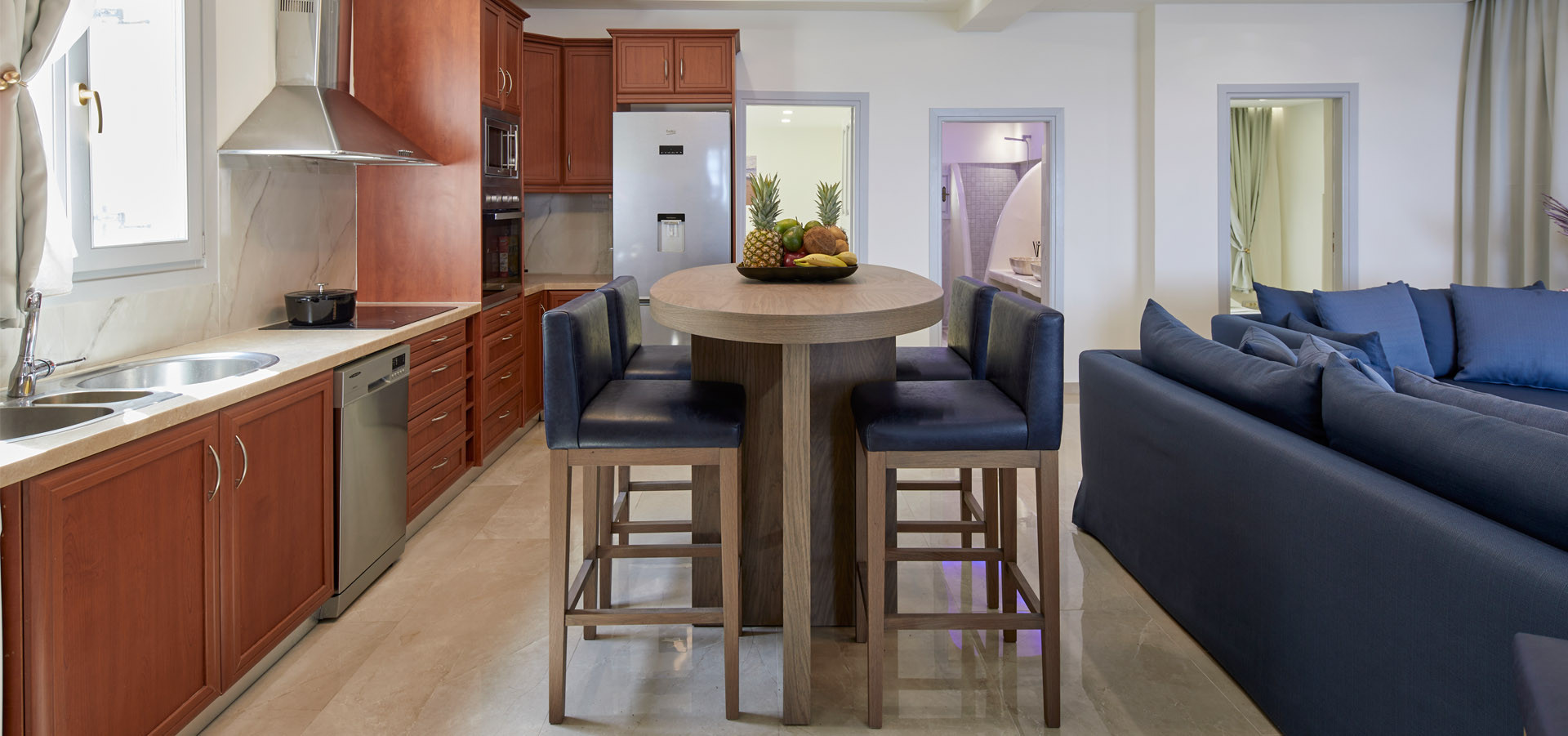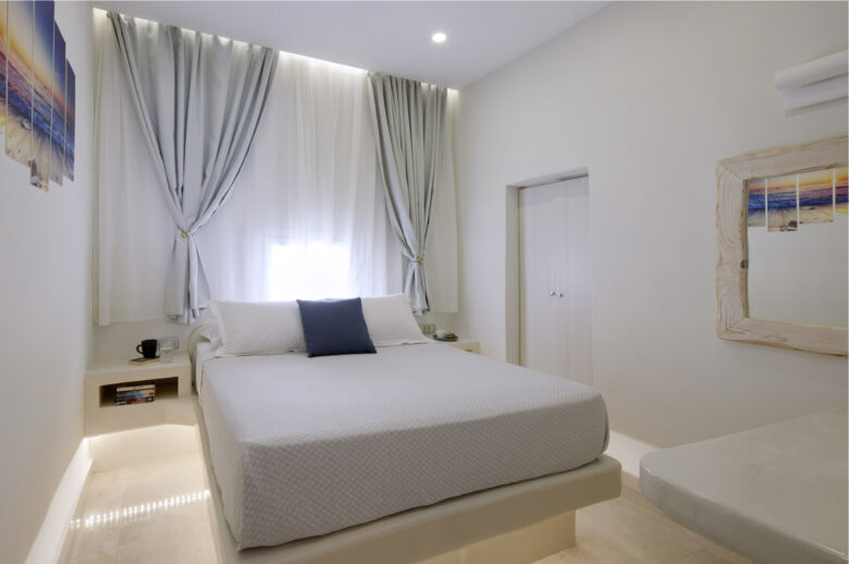 Let the panoramic view from your private spacious balcony (50 sq.m) mesmerize you and feel the romantic aura of the island as you watch the breathtaking sunrise and moonrise glistening on the golden and silver surface of the sea. This magical view to the Aegean Sea will sweep you off your feet while you admire the colorful horizon in the distance.